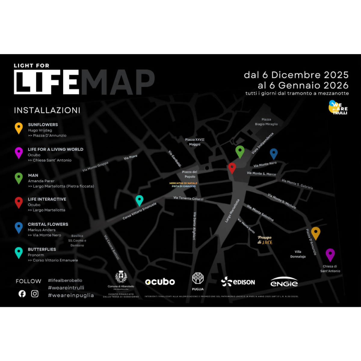 Alberobello is waiting for you with its magical Christmas' atmosphere. From December 5th, 2025, to January 6th, 2026, Piazza del Popolo will become the Trulli Food and Wine Village. Admission is free; prepare to experience unforgettable moments as a couple, with friends, or with family. An ice rink, markets, artisanal food, music, and local crafts will accompany your carefree moments. Furthermore, from December 6, 2025, to January 6, 2026, Alberobello will light up with creativity and sustainability! The Alberobello Light Festival is back to celebrate UNESCO's 30th anniversary with low-impact light installations, reusable materials, and works that combine art and respect for the planet (see the map below).