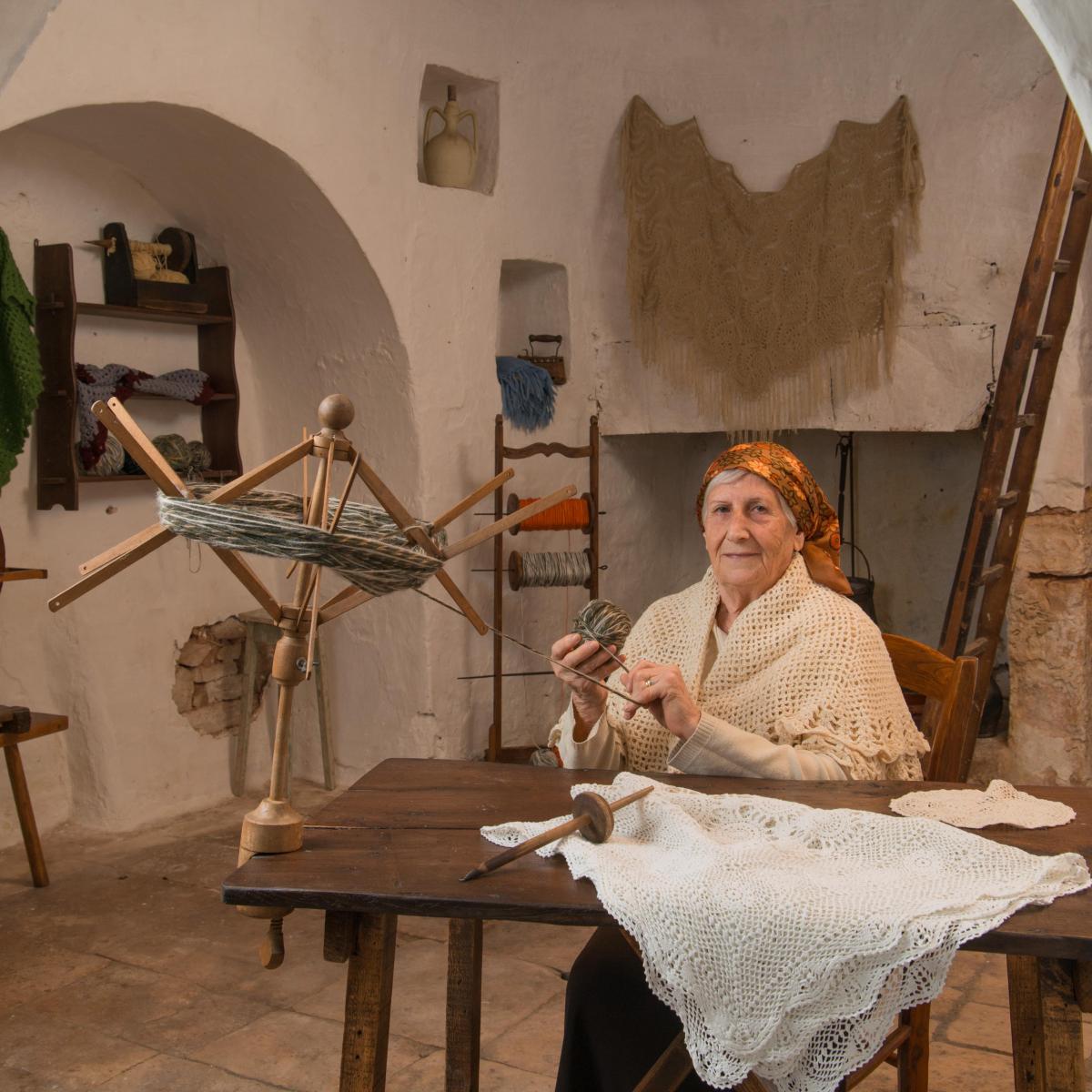 Ma torniamo a tempi più recenti. Immaginate, in un trullo di Alberobello, una donna che trasformava una massa informe di lana grezza in un filo da lavorare con i ferri o con l’uncinetto per realizzare calze, maglie, indumenti intimi, oppure con il telaio per lenzuola, coperte, scialli o tappeti.