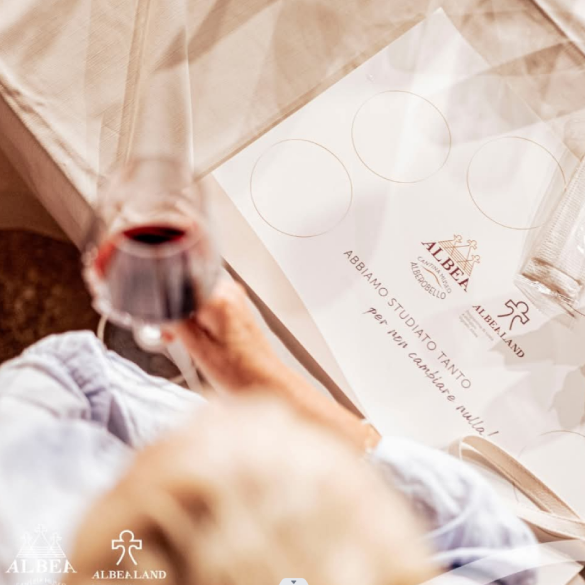 Accoglienza in cantina - Visita guidata in cantina e/o al museo - Transfer in vigna (se previsto) - Degustazione di 4 etichette Albea, accompagnate da una box aperitivo con specialità pugliesi: focaccia, burrata, formaggi e salumi locali, pomodori secchi e altre delizie.
